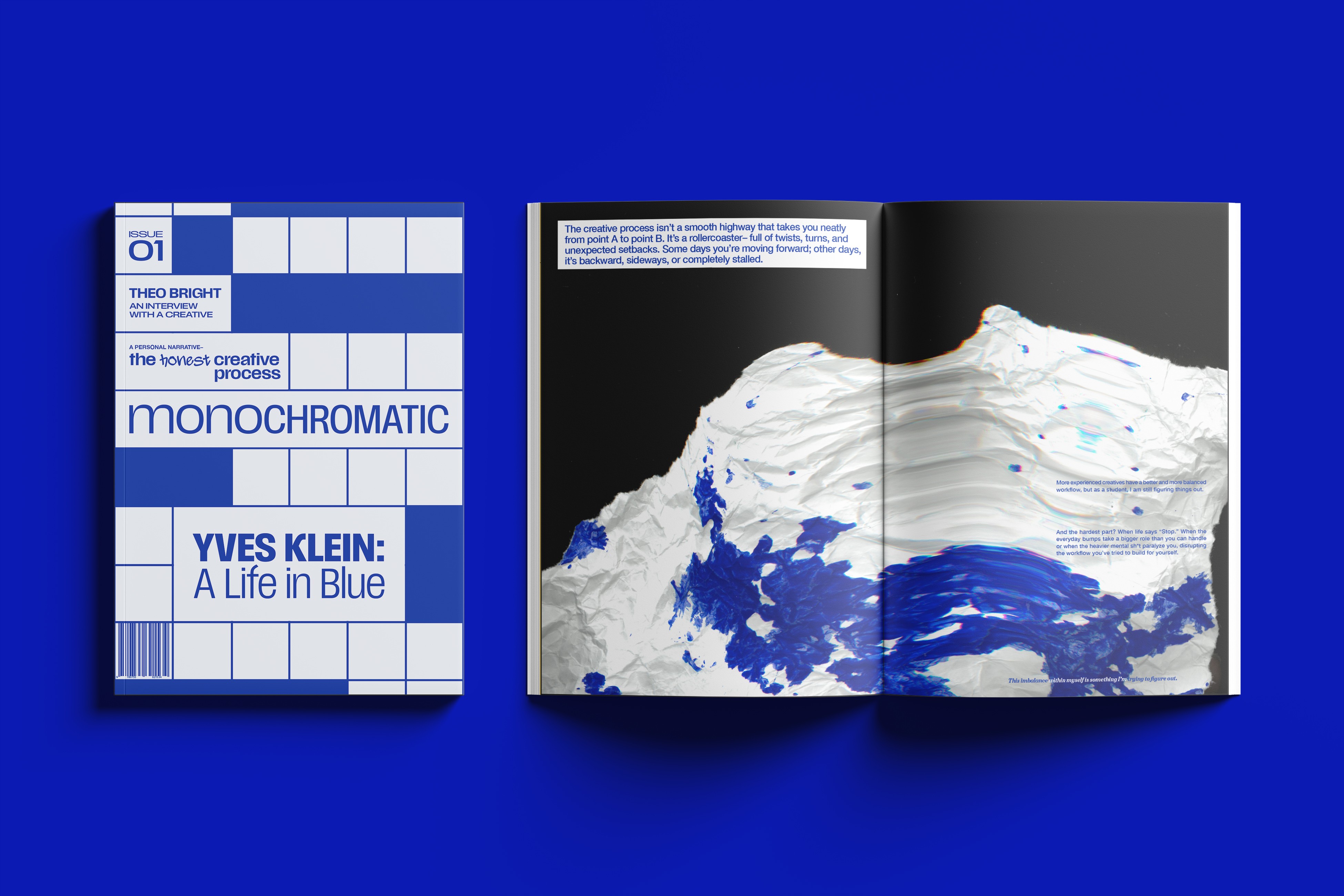 I created Monochromatic, a magazine where each issue revolves around a single color. Designed for creatives seeking inspiration outside the screen through color, emotion, and honest design. Issue one? A bold, personal take on a chromatic obsession, International Klein Blue.